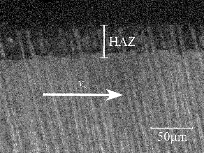 在激光功率為60W、重復(fù)頻率為0.4MHz、掃描速率為1m/s時(shí),CFRP表面熱影響區(qū)如圖 4所示。從圖中可以看出,CFRP表層纖維的排布方式對(duì)熱影區(qū)有顯著影響,當(dāng)掃描方向與表層纖維排布方向垂直時(shí),熱影響區(qū)達(dá)70μm;當(dāng)掃描方向與纖維排布方向一致時(shí),材料表面幾乎沒有熱影區(qū)。主要是因?yàn)樘祭w維的熱傳導(dǎo)率遠(yuǎn)遠(yuǎn)大于環(huán)氧樹脂的熱傳導(dǎo)率,未能達(dá)到CFRP燒蝕閾值處的脈沖能量沿著碳纖維方向傳播,所以當(dāng)掃描方向與表層纖維排布方向一致時(shí),沿著掃描方向傳播的能量與下一個(gè)脈沖能量共同用于去除CFRP材料,掃描深度也更大,對(duì)切縫兩側(cè)造成熱影響區(qū)較?。欢?dāng)掃描方向與表層纖維排布方向垂直時(shí),能量沿著掃描垂直方向傳播,切縫兩側(cè)熱量累積,對(duì)CFRP造成熱損傷,導(dǎo)致嚴(yán)重的熱影響區(qū)。