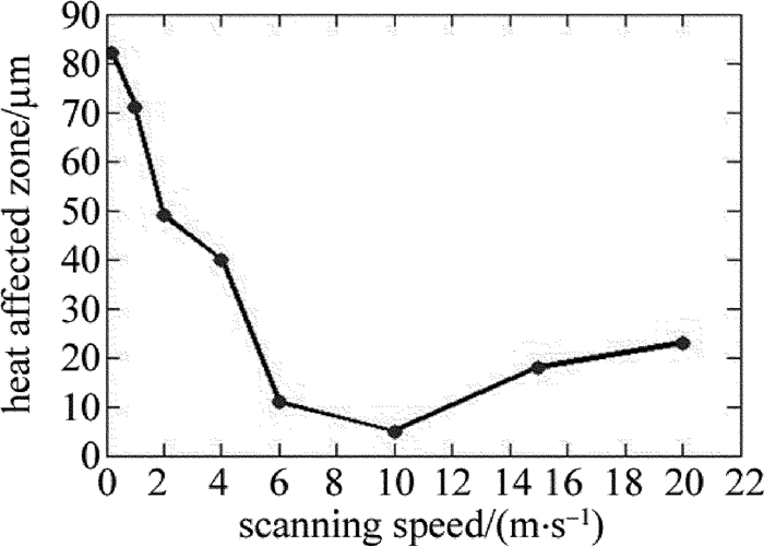 (3) 掃描深度隨著掃描次數(shù)的增加呈非線性增加,而隨著掃描次數(shù)的增加熱影響區(qū)有一定的減小,當(dāng)重復(fù)掃描20次時(shí),可以保證熱影響區(qū)較小的同時(shí)有較高去除效率。