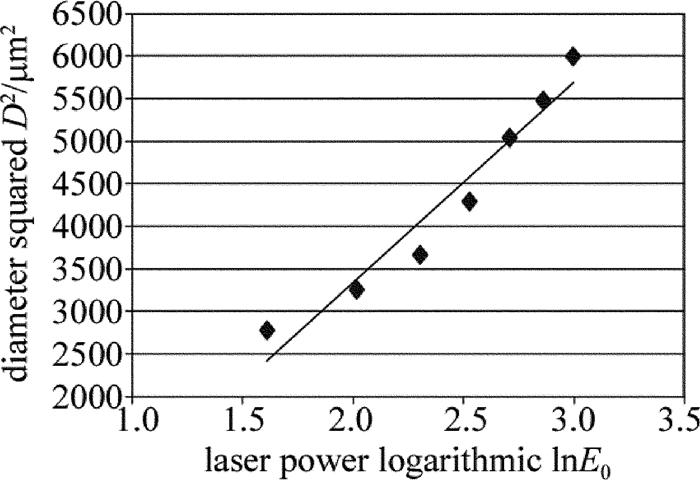 目前確定燒蝕閾值的方法主要有在線觀測、形貌檢測及數值計算等。本實驗中采用數值計算的方法并輔以顯微觀測,推導出燒蝕直徑D與脈沖激光能量E的函數關系,將線性曲線外推至D=0處,從而得出材料的破壞閾值,同時還能夠獲得光束的焦點半徑。