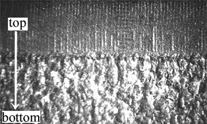 圖 7為不同頻率下縫寬和錐度的變化曲線。其中激光功率20W,切割速率30mm/min,脈沖頻率分別為30Hz, 40Hz, 50Hz, 60Hz。從圖中看出,激光脈沖頻率對切縫寬度影響大。隨著頻率的增大,縫寬顯著減小,同時切割錐度也隨之減小。脈沖頻率的大小決定著激光光斑的重疊程度,圖 8為PCBN激光切割、掰片、簡單去熔渣后斷面形貌圖。上層為PCBN,下層為硬質合金。圖中能明顯看出切割后的條紋形狀。根據單脈沖激光能量E與平均輸出功率Pave和脈沖頻率f的關系式E=Pave/f可知,隨著脈沖頻率的增加,單脈沖能量減小,光斑重疊度增大,這對表面切割質量的提高和裂紋的減少起著重要作用。