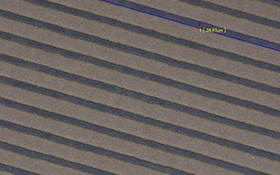 玻璃/薄膜表面氧化銦錫(ITO)、FTO、銀漿(Ag)、碳納米管(CNT)、石墨烯、納米銀、鉬鋁鉬、銅、高分子導電膜、鋁薄膜、PERC、鈣鈦礦電池、TCO、碳粉、氧化鋯、氧化鈦、氧化鋅、金等涂層材料的超細線寬激光蝕刻。可直接對白玻璃激光刻蝕、劃線,最小線寬小于10微米。